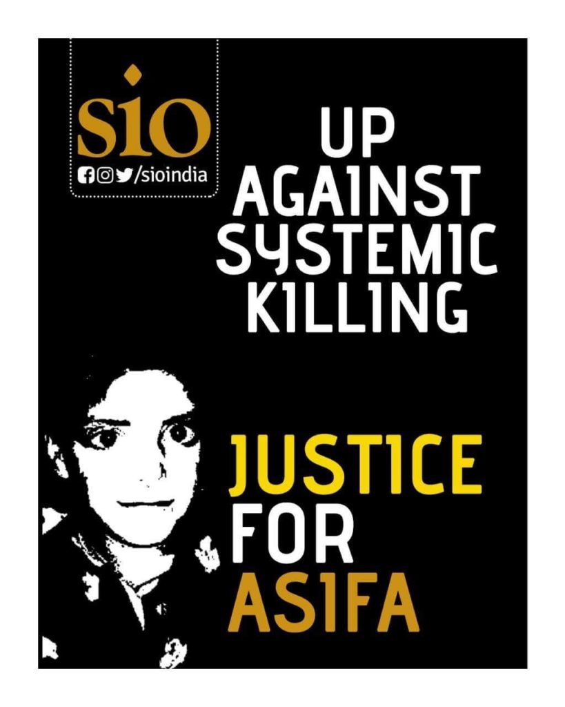 ஜம்மு காஷ்மீரில் 8 வயது சிறுமியான ஆஷிஃபா கடத்தப்பட்டு 8 நாட்கள் அடைத்து வைக்கப்பட்டு கொடூரமாக வன்புணர்வு செய்யபபட்டு கொலை செய்யப்பட்டுள்ளார். இரண்டு பேரால் கற்ப்பழிக்கப்பட்ட பின்பு சுவற்றில் அடித்து கொலை செய்யப்பட்டார். மரணித்த பின்பும் ஒரு காவல் அதிகாரியால் மீண்டும் வன்புணர்வு செய்யப்பட்டார். கைது செய்யப்பட்ட காவல்துறை அதிகாரி அந்த சிறுமியின் சமூகத்தைச் சார்ந்த மக்களிடையே அச்சத்தை விதைக்கவே இந்த செயலை செய்ததாக வாக்குமூலம் வழங்கியுள்ளான். ஆளும் பாஜகவின் மாநில செயலாளர், இந்துத்துவ இயக்கமான ஏக்தா மன்ச் இணைந்து கைது செய்யப்பட்டவர்களை விடுதலை செய்ய வேண்டும் என போராட்டம் நடத்தியுள்ளனர். நேற்று வக்கீல்கள் சேர்ந்து குற்றப் பத்திரிகை தாக்கல் செய்ய விடாமல் நீதிமன்றத்தில் போராட்டத்தில் ஈடுபட்டு பல மணி நேரம் முடக்கினர்.